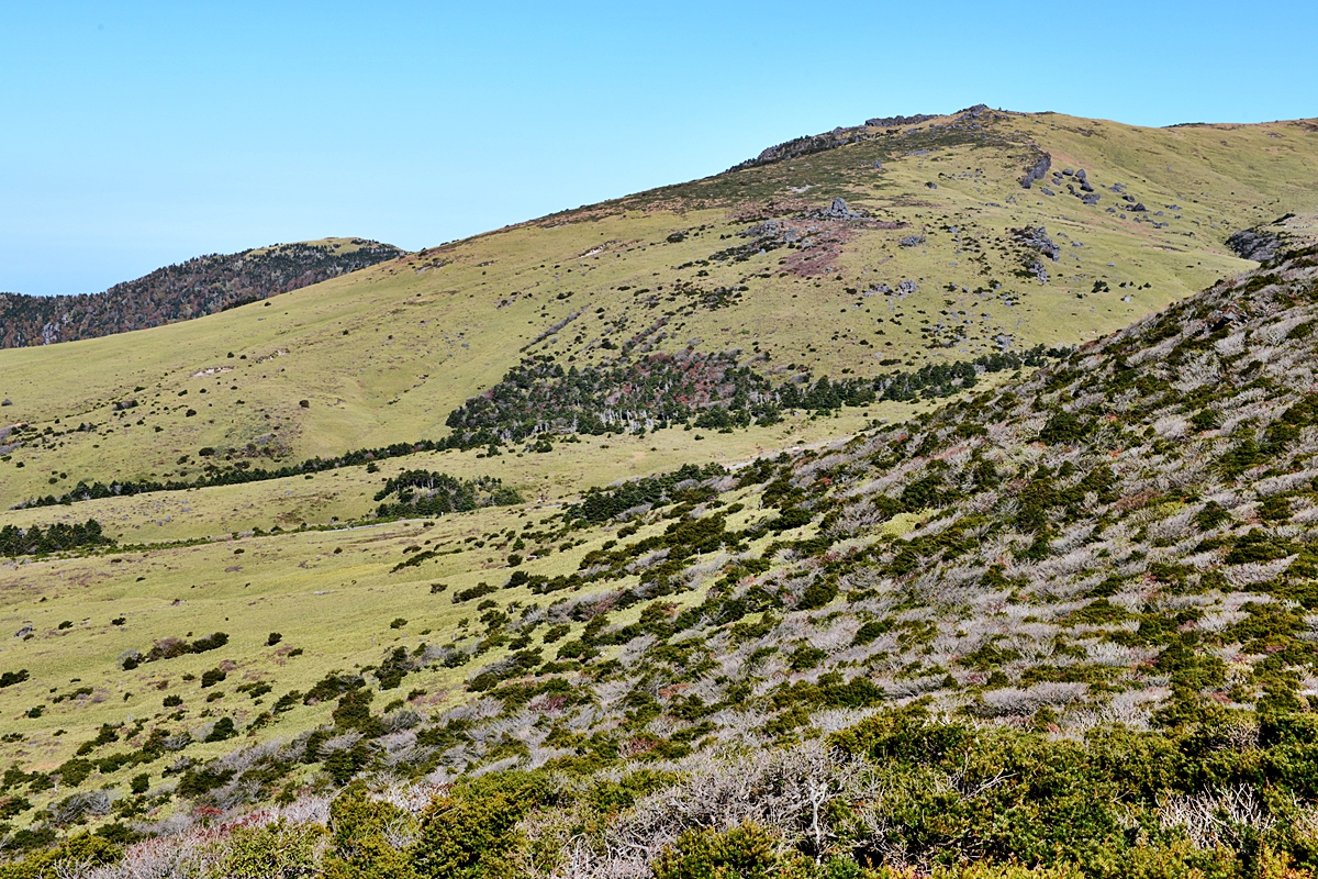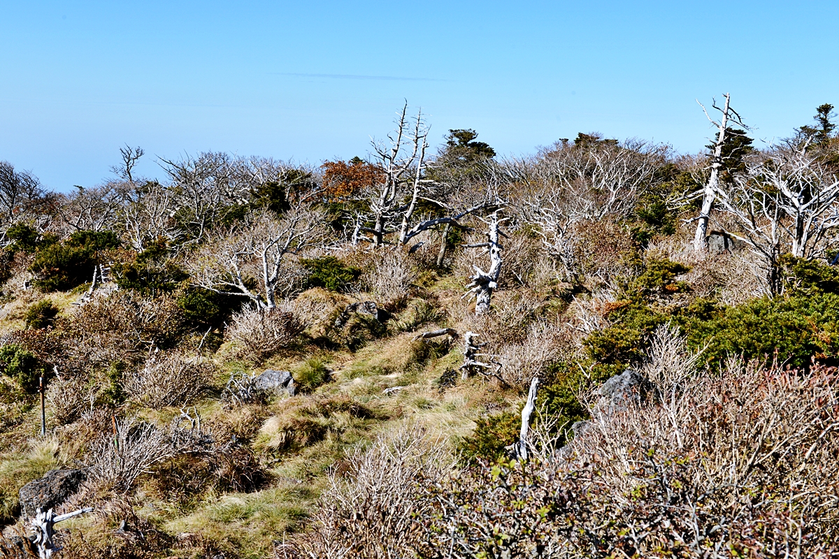 나뭇잎을 모두 떨구어버린 백록담 부근의 하얀나뭇가지, 붉게 물든 영실계곡의 단풍, 살아서 천년사는 나무는 아직도 푸른데, 죽어서 천년 사는 나무는 흰가지만 들어내고 있는 주목, 붉은 잎과 가지를 납작 업드려 화려한 봄을 기다리는 진달래, 아직도 푸르름을 간직한 대나무들...