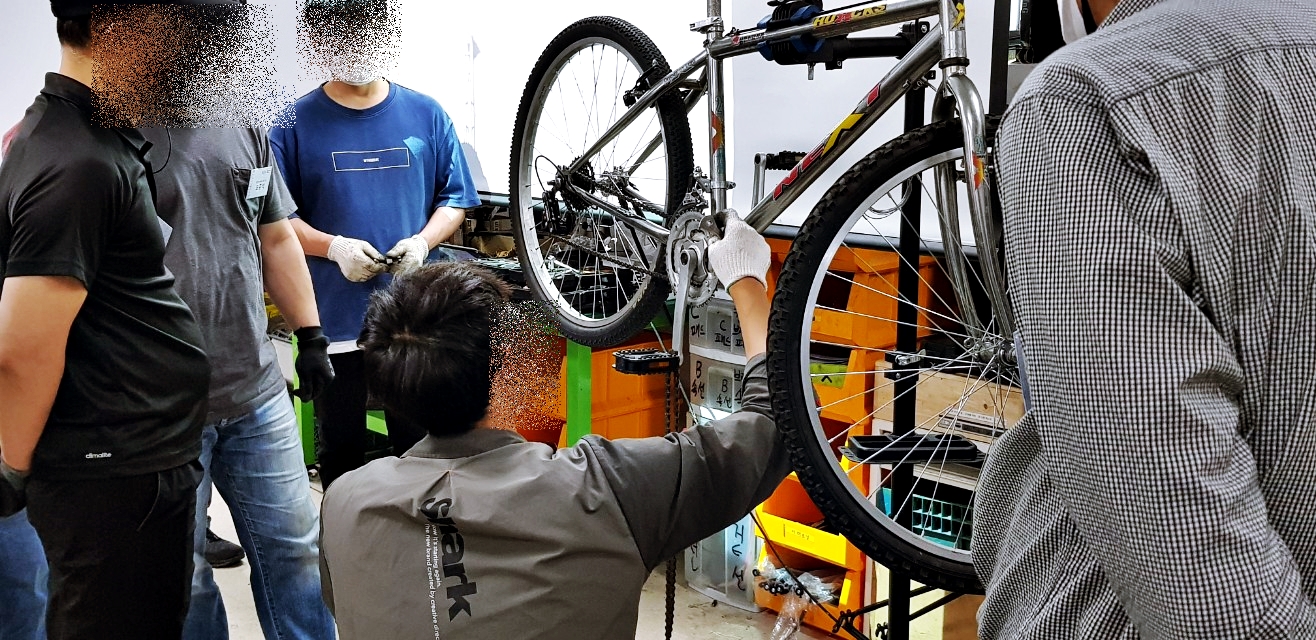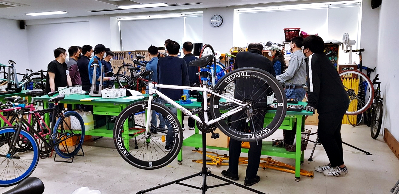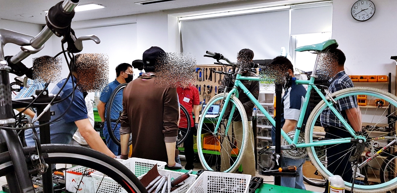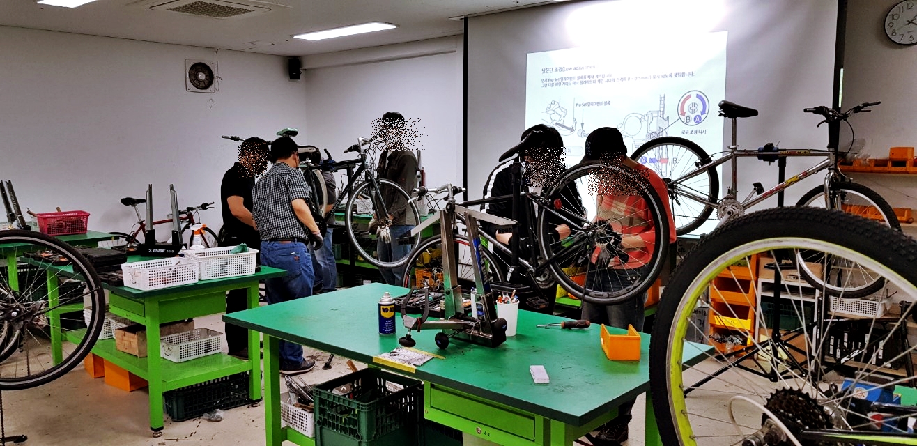 자전거 수리 교육은 주1회 3시간씩 3개월간 진행한다. 시간으로 따지면 36시간이다. 자전거의 종류 및 명칭, 자전거 분해, 각파트에 대한 분해조립 및 정비, 유지관리가 주요 목표다. 15명 정도의 교육을 사람들은 자전거타는 것이 좋아서 스스로 정비를 하고 관리를 하기위한 지식을 얻으러 오는 사람이 대부분이지만 개중에는 자전거 정비 관련 직업을 염두해 두고 오는 사람들도 있는 것 같다. 응급처치(바퀴 펑크패치 등)는 한두시간정도면 요령을 습득할 수 있으니 36시간은 제법 전문적인 기능을 습득하기 위한 시간이 될 수도 있겠다.