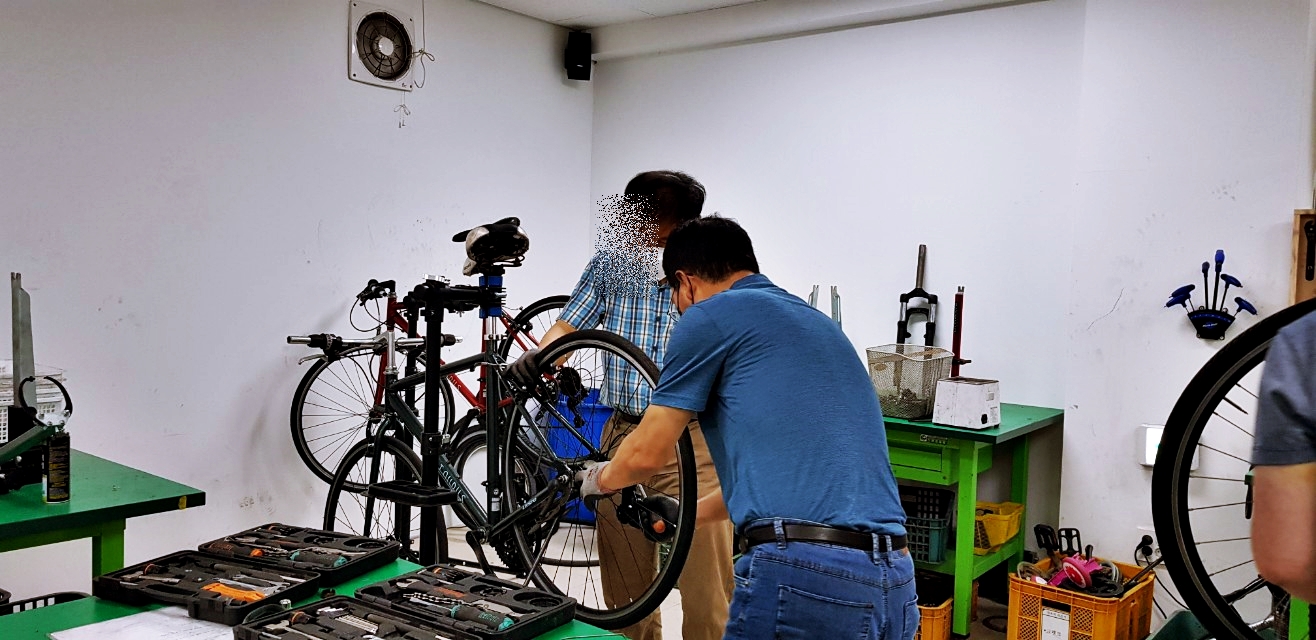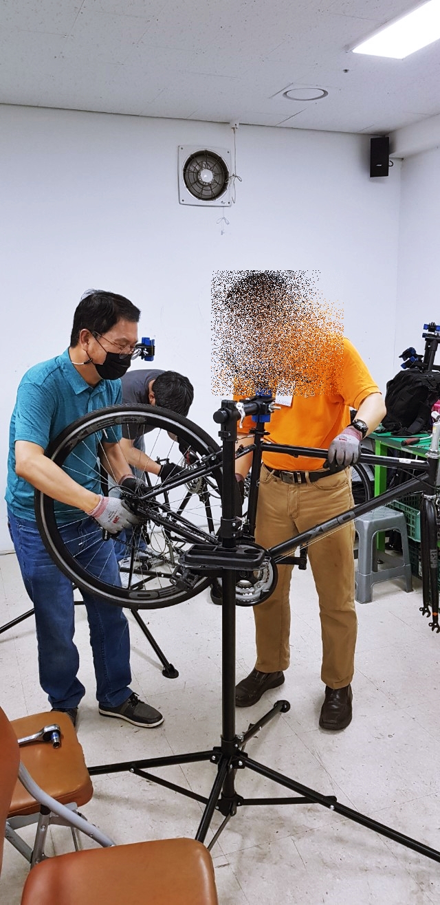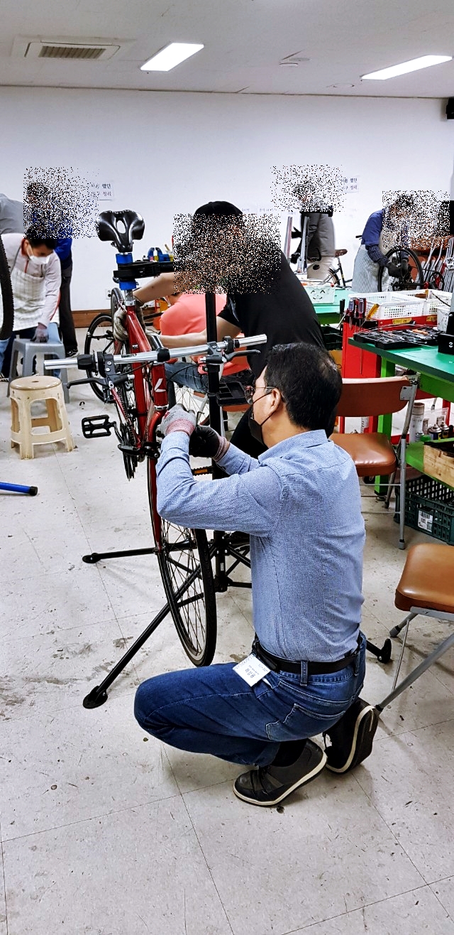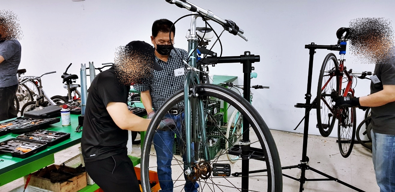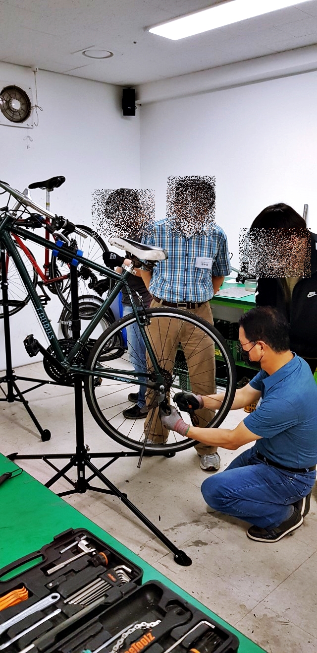자전거 수리 교육은 주1회 3시간씩 3개월간 진행한다. 시간으로 따지면 36시간이다. 자전거의 종류 및 명칭, 자전거 분해, 각파트에 대한 분해조립 및 정비, 유지관리가 주요 목표다. 15명 정도의 교육을 사람들은 자전거타는 것이 좋아서 스스로 정비를 하고 관리를 하기위한 지식을 얻으러 오는 사람이 대부분이지만 개중에는 자전거 정비 관련 직업을 염두해 두고 오는 사람들도 있는 것 같다. 응급처치(바퀴 펑크패치 등)는 한두시간정도면 요령을 습득할 수 있으니 36시간은 제법 전문적인 기능을 습득하기 위한 시간이 될 수도 있겠다.
