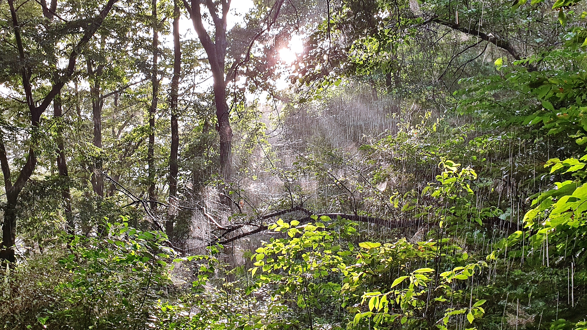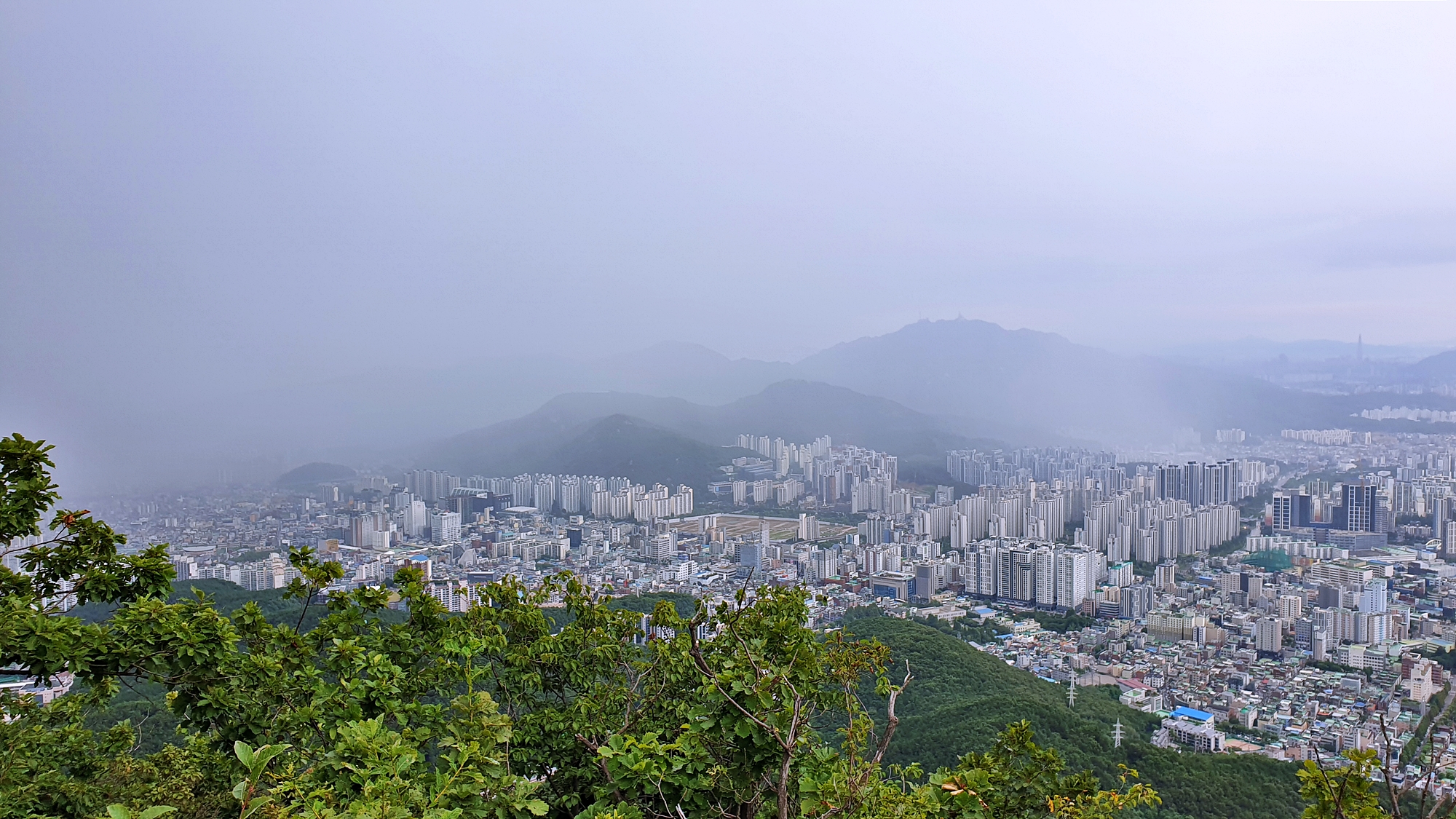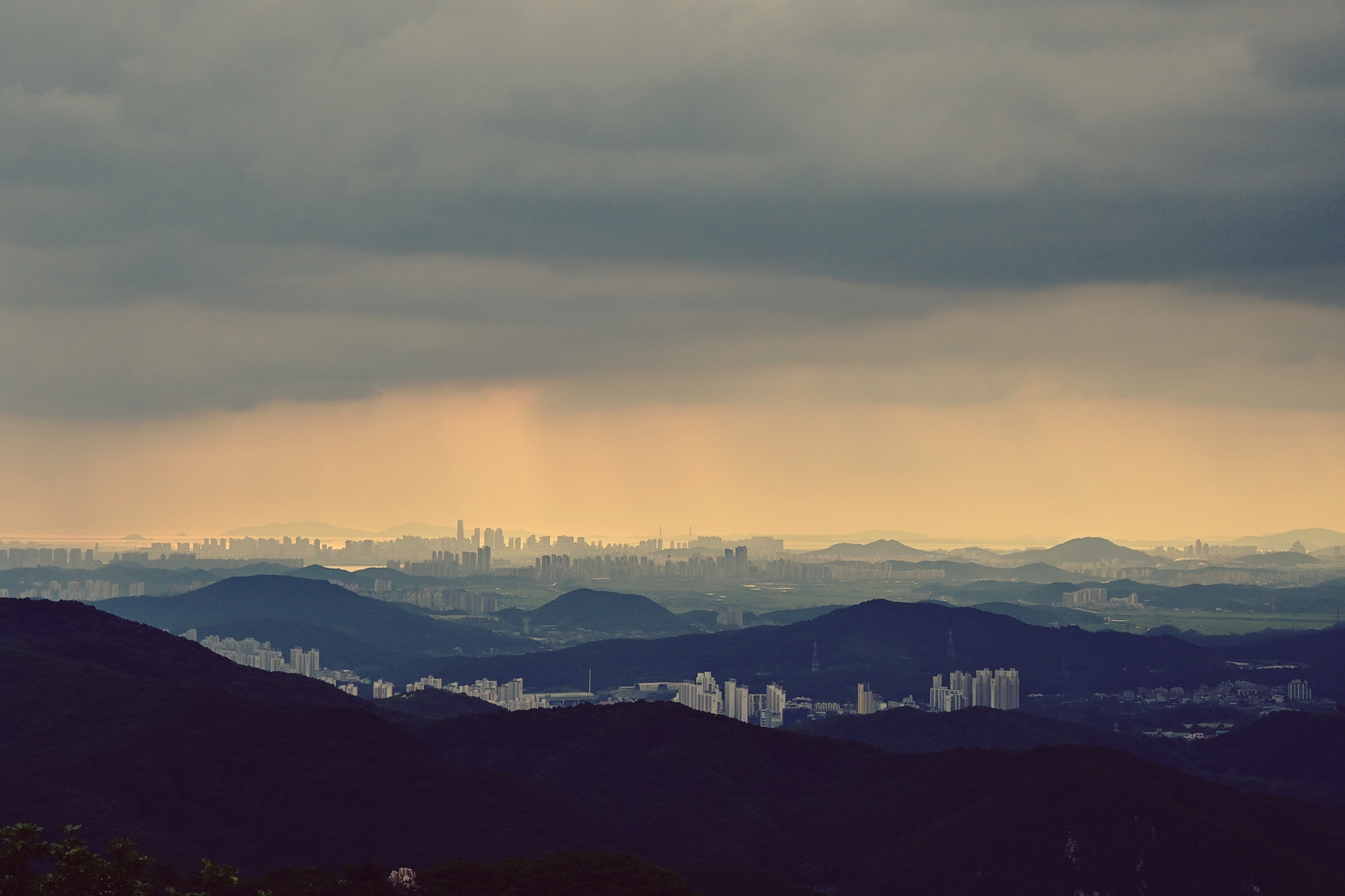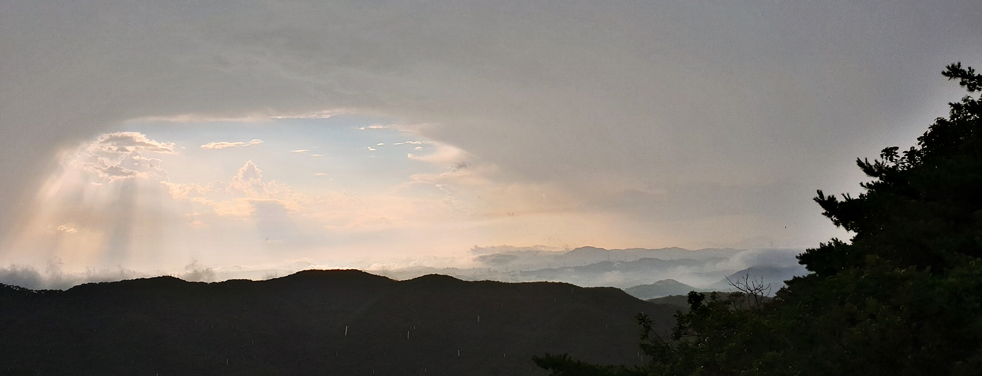 인천 송도방면으로 구름 사이로 비추는 햇볕에 반사된 건물 군들이 반짝인다. 태을봉을 지나 능선을 타고가다 수리산 성지로 하산길을 잡는다. 잠시 햇볕 사이로 소나기가 지나가고 급격하게 골짜기로 어둠이 몰려온다.