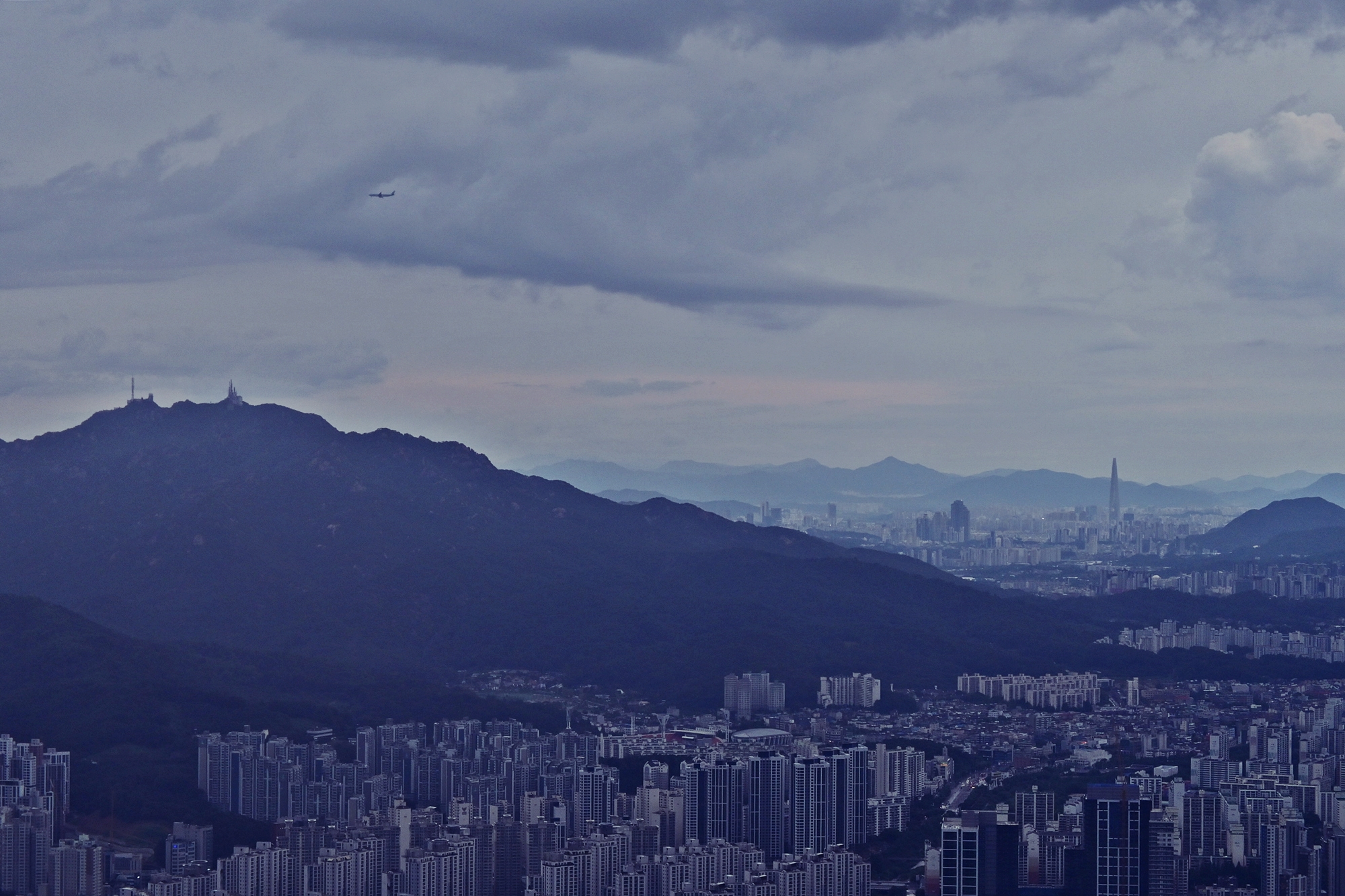 관모봉에 오르니 서늘한 바람이 불어오고, 서울 방향의 관악산으로 비가 몰려온다. 천둥과 번개 소리는 요란하지만 비가 많이 오지 않을 것 같다. 비바람이 몰려오니 주변에 몇몇 보이던 사람들도 급히 하산을 한 모양이다.