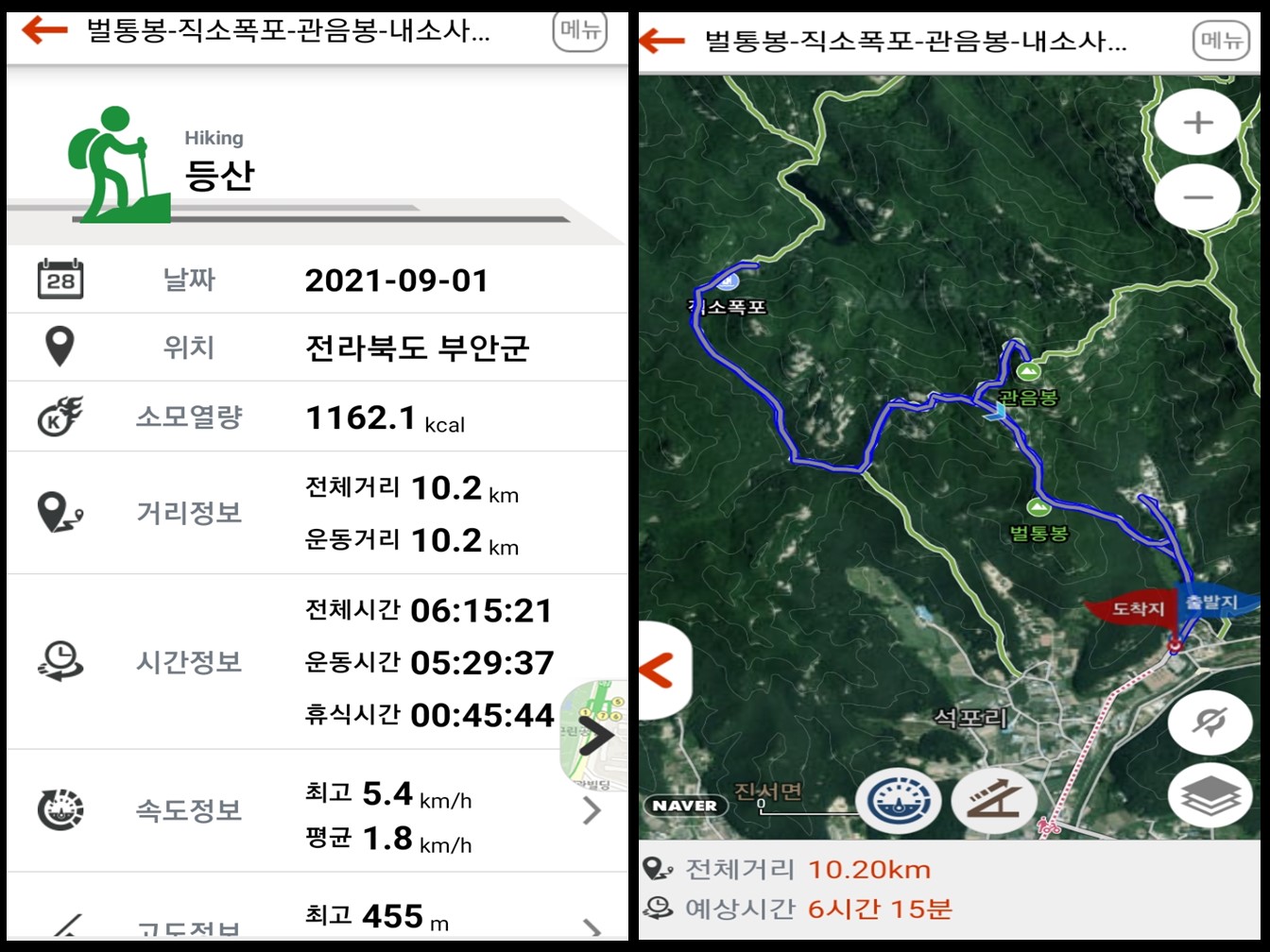 내소사에서 직소폭포를 가는 구간은 오르막과 내리막이 번복되는 구간이 있어 거리에 비례하면 힘이 든 구간이다. 가능하면 짧게 코스를 잡는다고 한 것이 직소 폭포를 왕복하며 변산의 정상인 관음봉까지 경유를 하다 보니 제법 힘든 산행을 하게 되었다.
