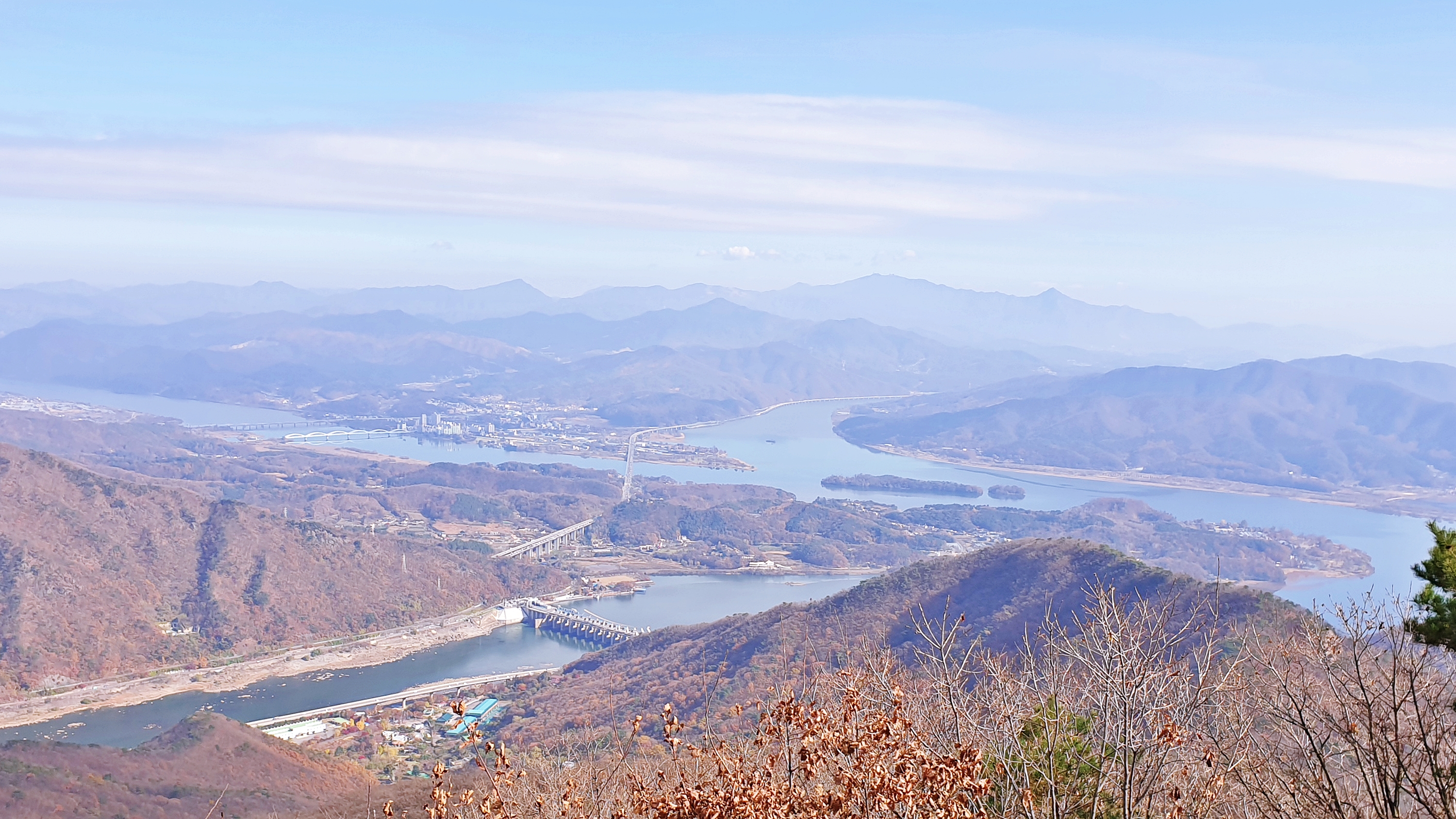 서북쪽 양수리 방면으로 아마도 호명산, 화야산, 중미산, 유명산으로 보이는 산군이 옅은 구름 아래 웅장(?)하게 어울어져 위치해 있다.