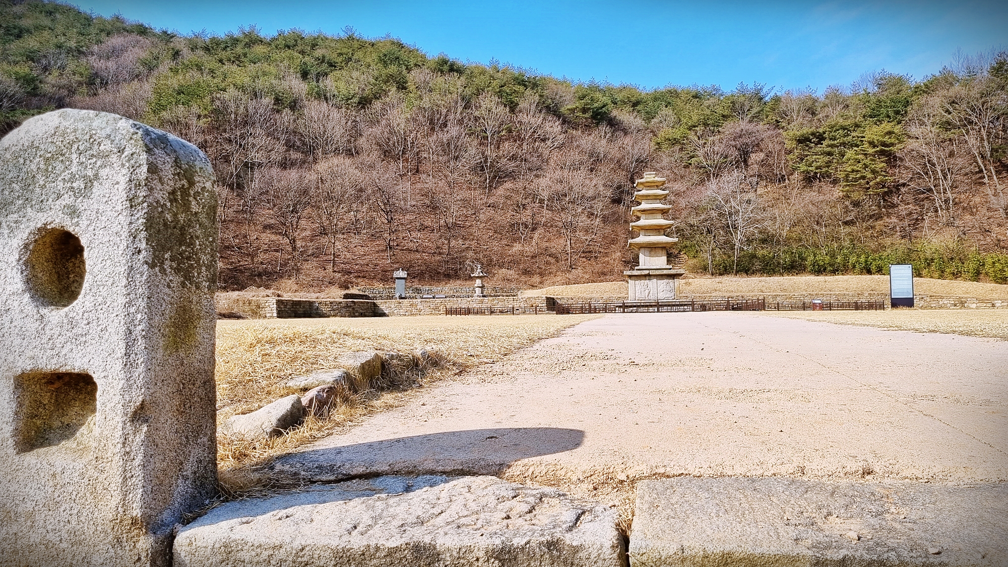 산 가까이에 사탑과 개울을 건너 기전 두기둥 우뚝솟은 당간지주는 넉넉한 여백으로 아무런 역사적 선입견이 없는 여행자에게 다 알지 못함으로 인한 호기심을 남겨주어 일종의 신비감마저 느끼게 한다.