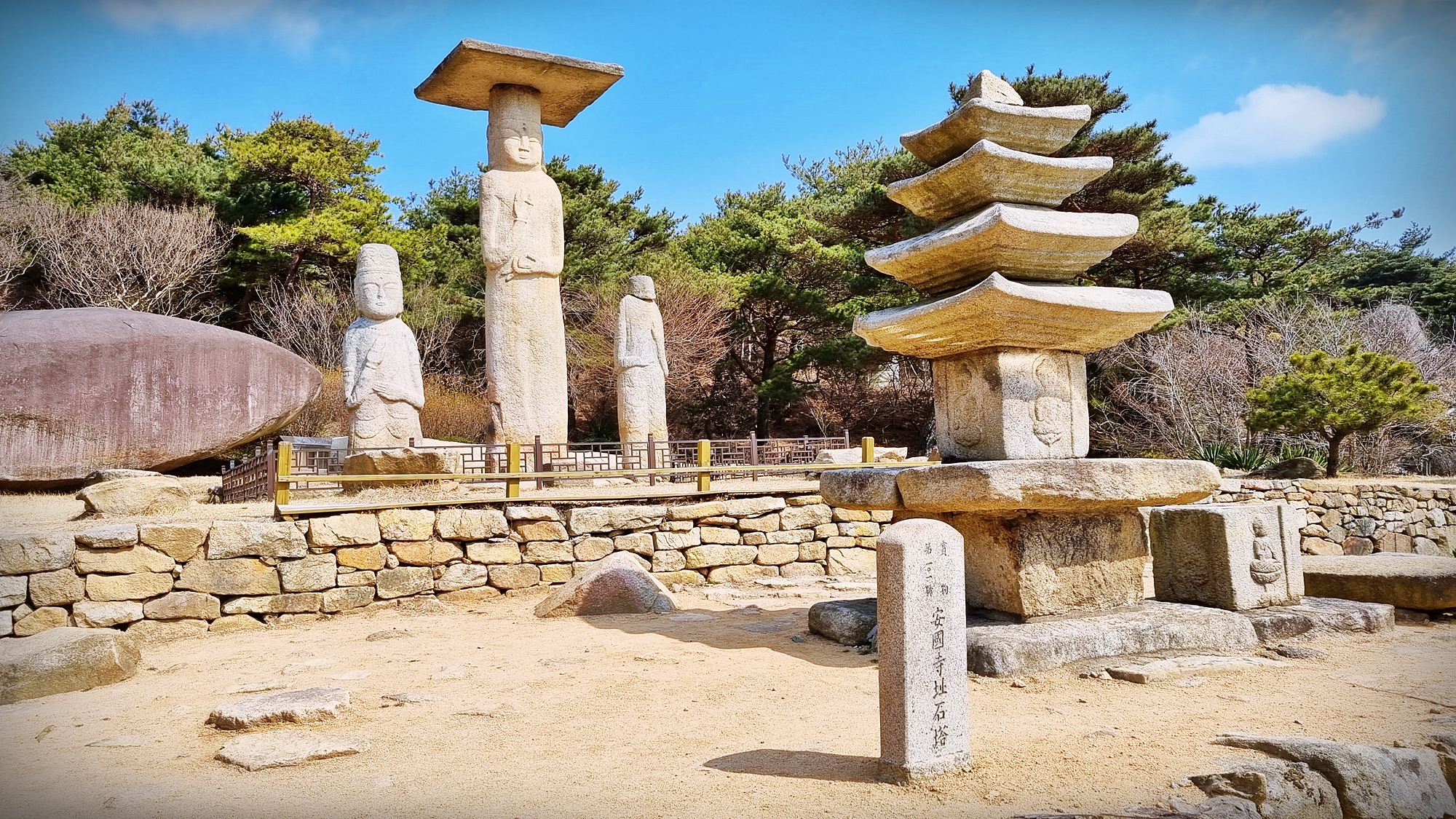 황량한터 보원사지에 비하면 안국사지는 석조여래 삼존(본존과 좌우협시보살상)입상과 넓지 않은 터로 인하여 상상 보다는 실물을 볼 수 있는 또다른 신비감을 전해준다. 주변의 풍경과 어색하지 않은 불상을 보고 있노라니 어린시절 교과서의 어느 부분에서 본 듯 한 은진미륵이 떠올랐다.