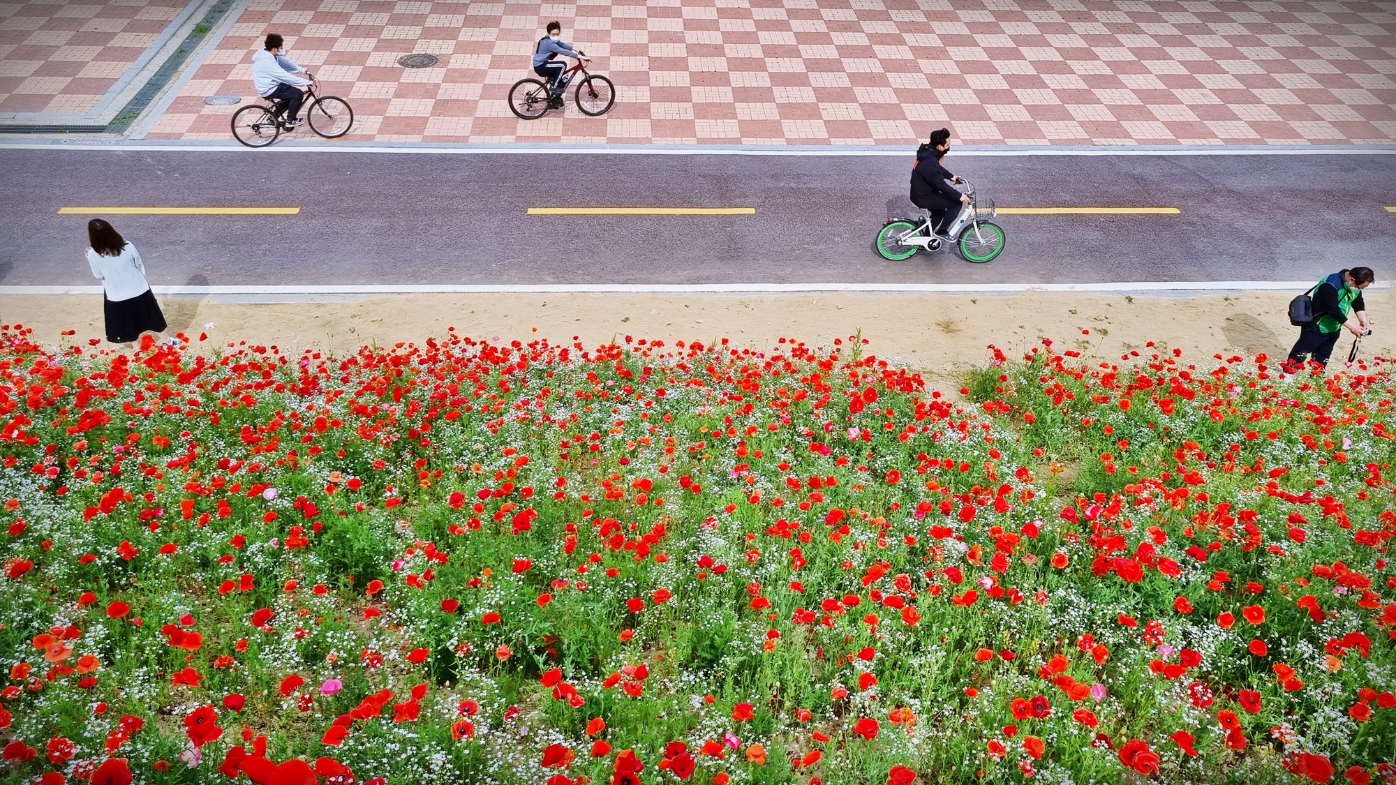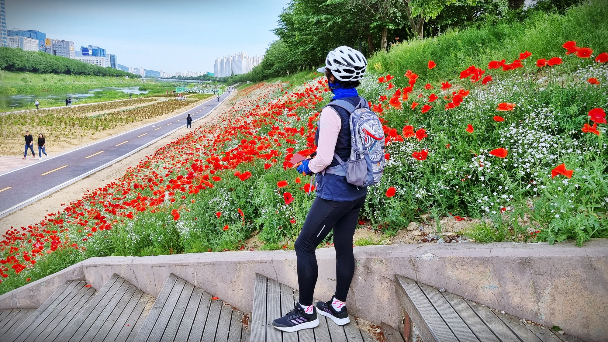 누군가는 자전거 타는 것에 집중을 하고, 누군가는 꽃을 카메라에 담는다.