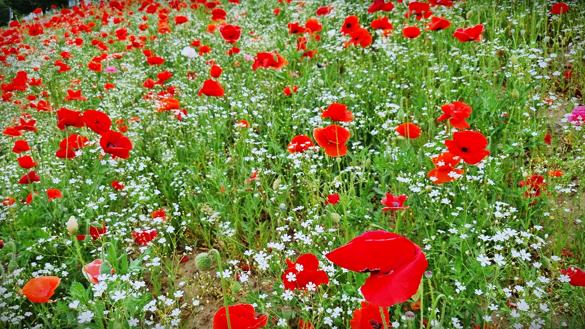 서울의 고척동 부근까지 갔다가 반대편 도로를 타고 회귀를 하는 중 광명대교 주변에 양귀비꽃을 군락으로 가꾸어 놓은 곳이 눈에 뜨인다. 하얀 안개꽃과 꽃 양귀비의 붉은 색이 잘 어울린다.