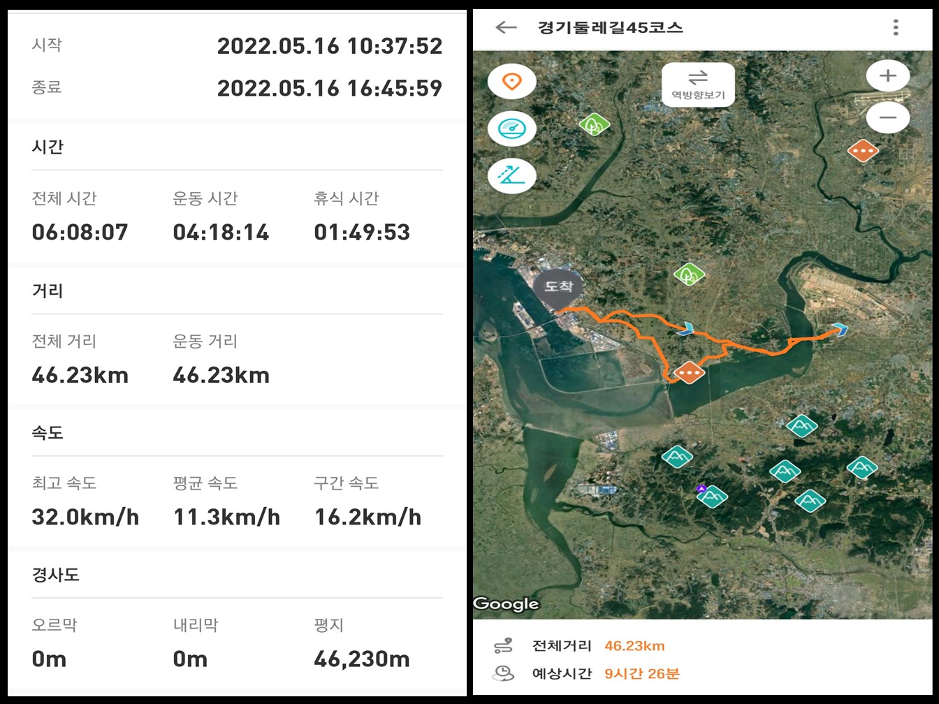 경기둘레길 45코스는 신대리마을회관에서 시작하여 평택항 마린센터에서 종료하는 22Km에 달하는 길이다. 도보코스 중간에 야트막 하지만 마안산(112.8m)을 지나니 자전거로는 우회를 해야 한다.