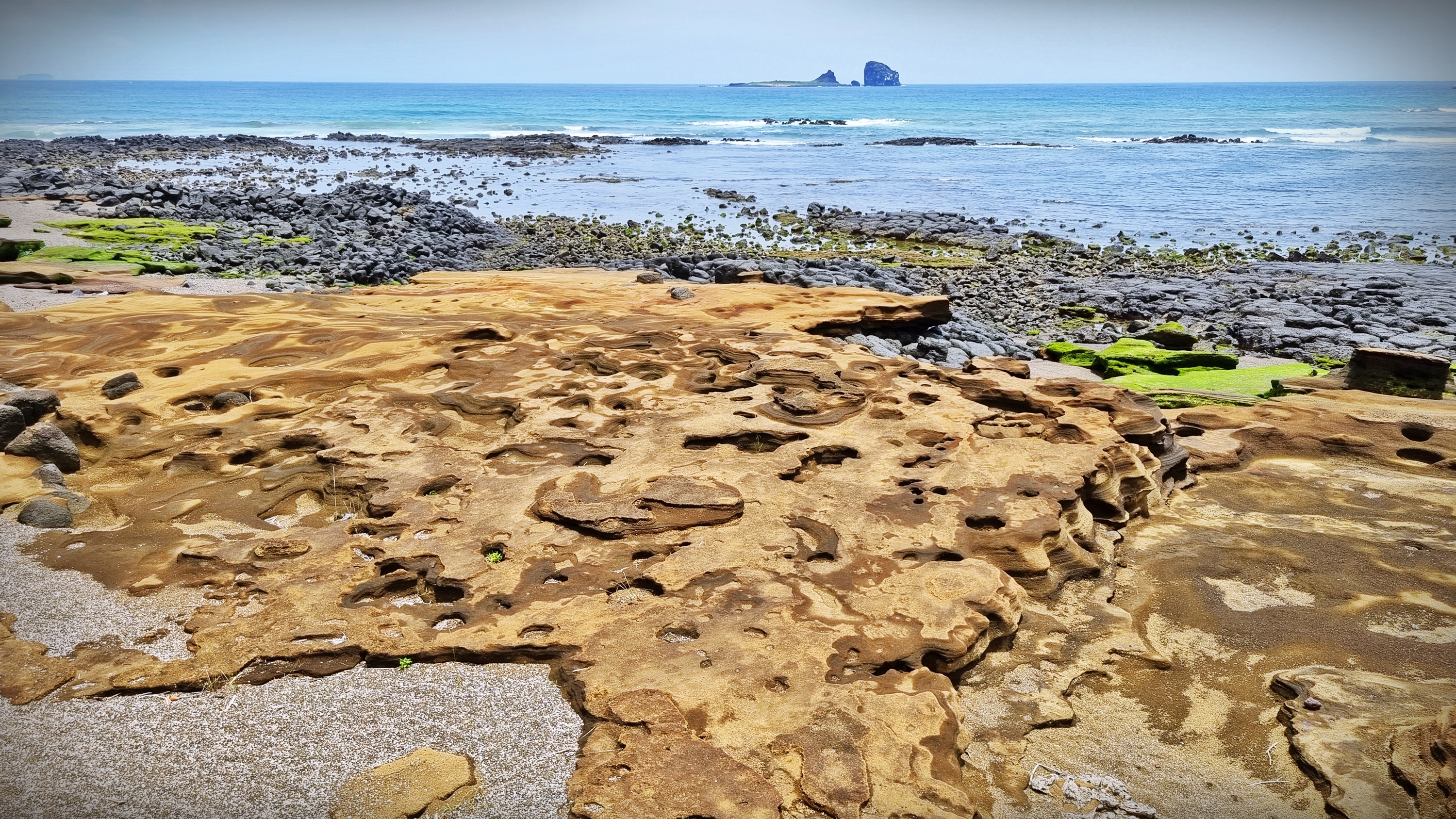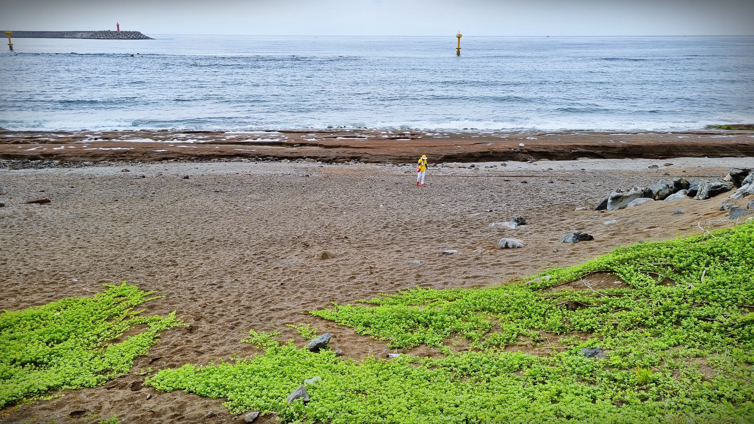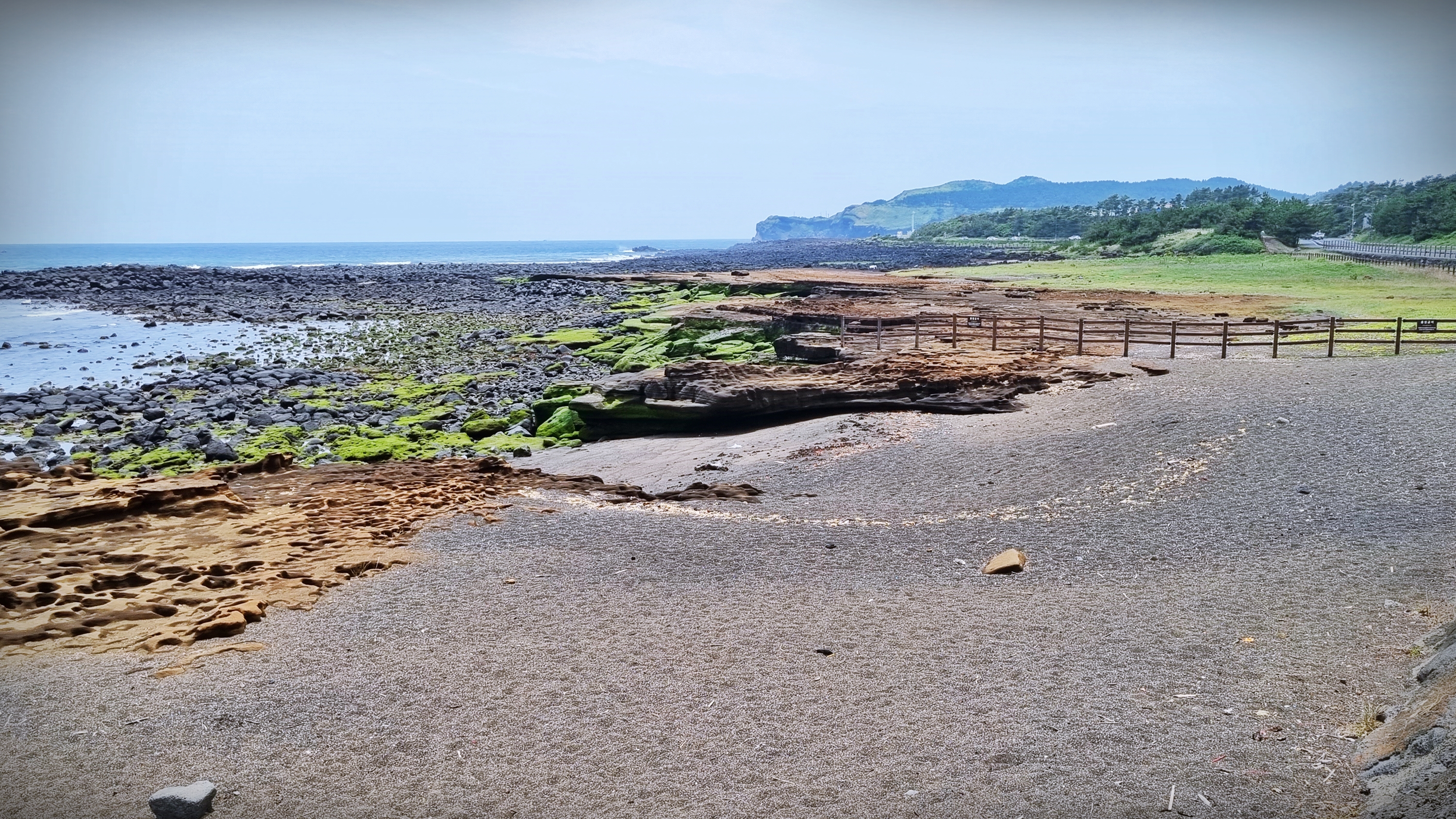 해변은 모래와 주상절리 그리고 용암이 굳어진 현무암이 적당히 배치 되어있었고, 황우치 해안은 ‘산방산용머리해안 지질 트레일’로 연결되는 용암들이 바닷속을 향하고 있었다.