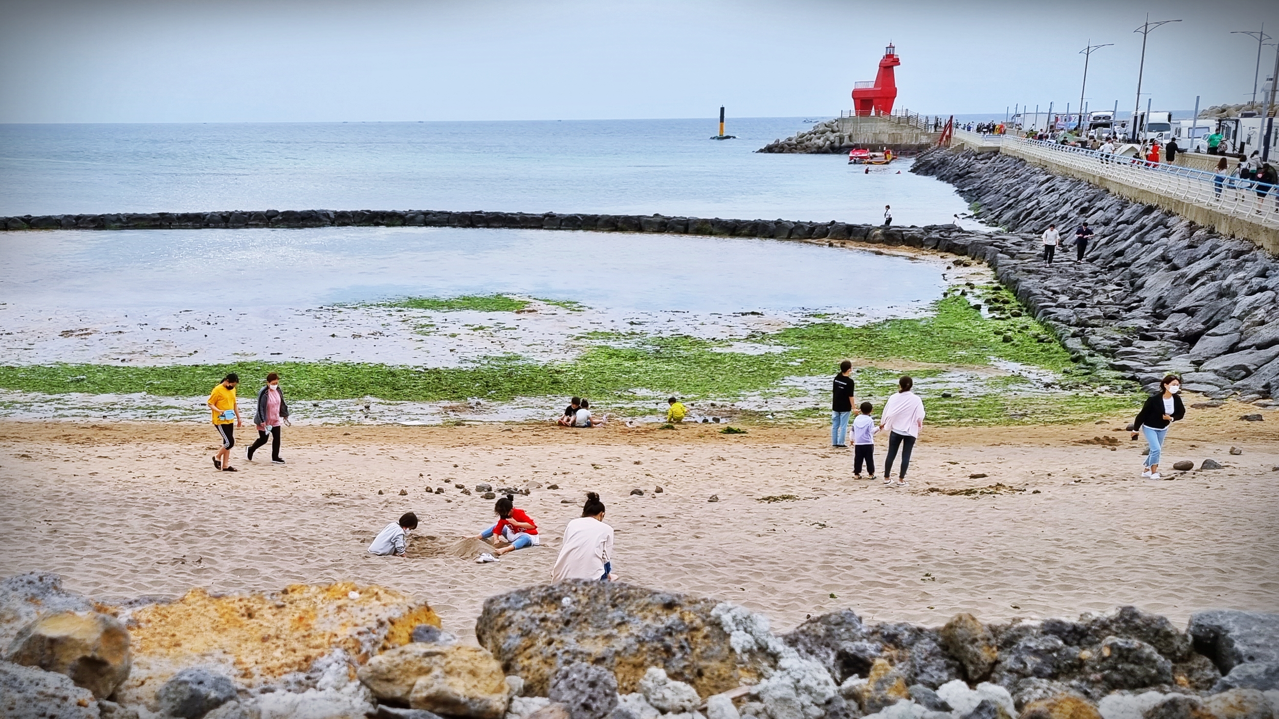 제주시내에서 가까워서 인지 관광객이라기 보다는 주변에 사는 사람들이 바닷가에 휴식을 즐기는 분위기이다. 바람막이 방파제에 바람막이 텐트를 치고 간식과 음료를 즐기고 있었다.