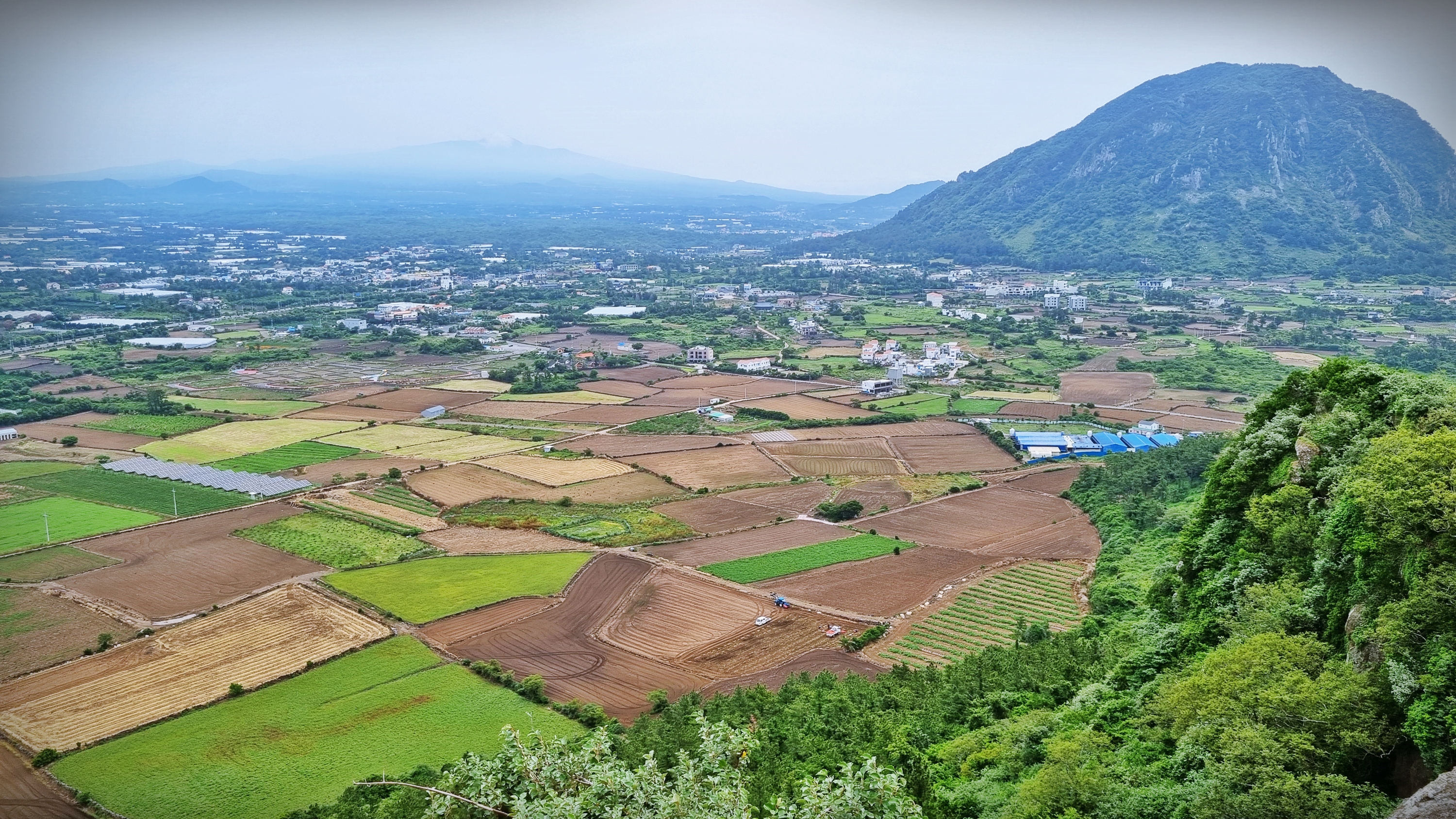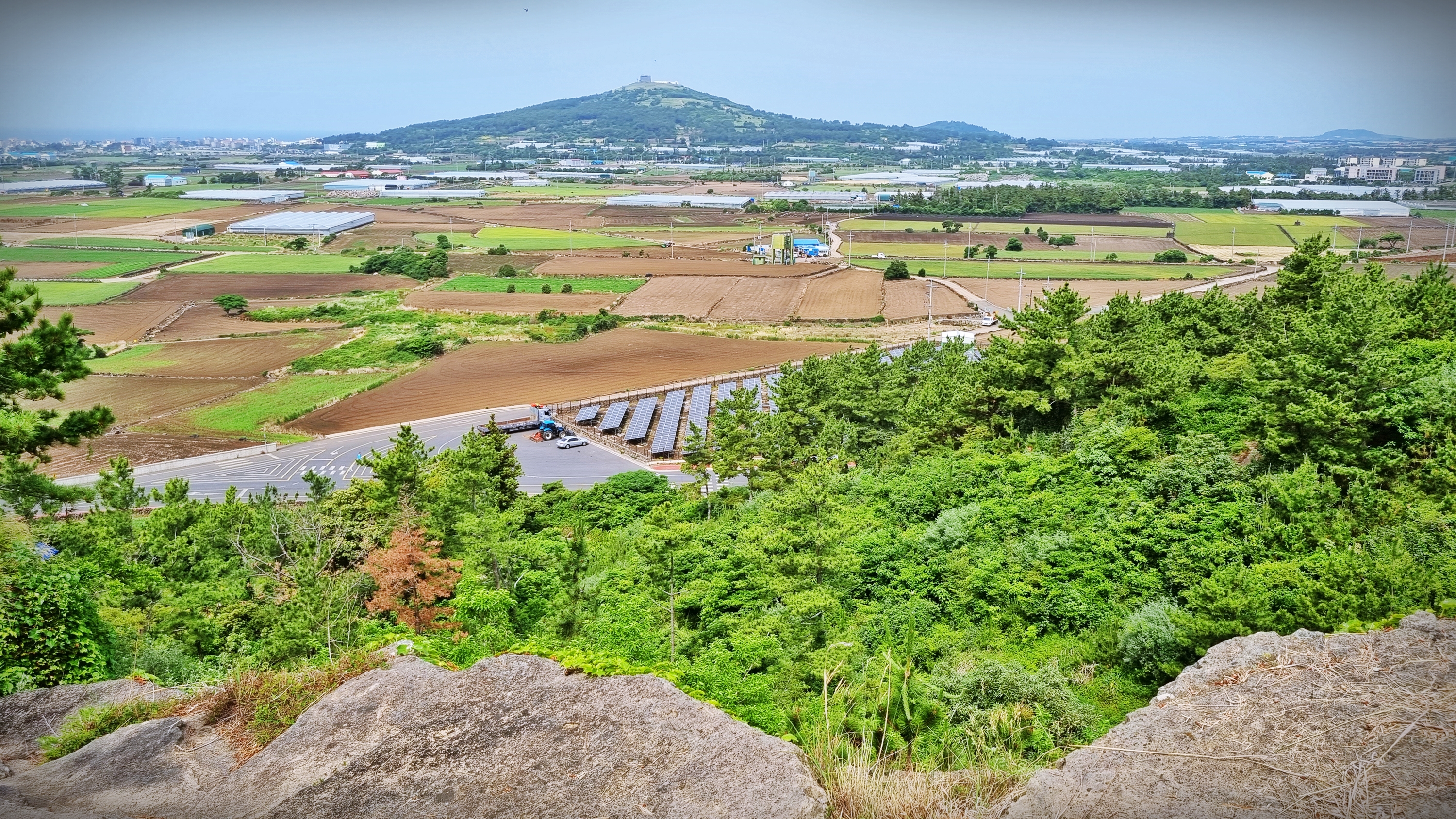 정상에 오르면, 역시 산방산이 한눈 가득히 들어오고, 주변의 논밭으로는 감자를 수확하고 제주 원색을 드러낸 흙으로 논밭들의 풍경이 정겨워 보인다.