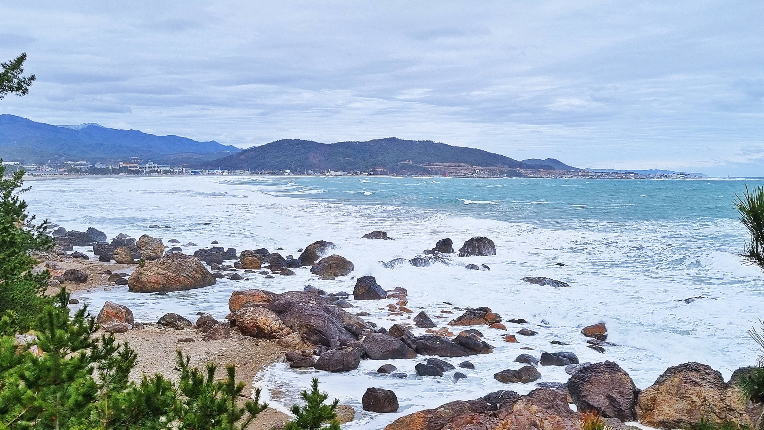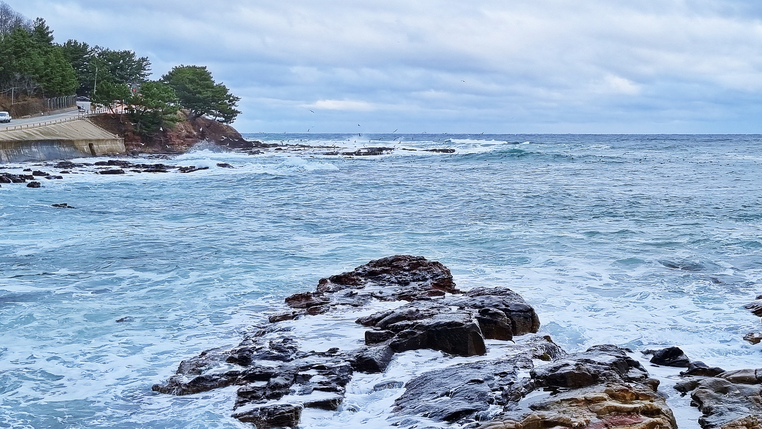 바다를 보고 있노라면 하얀 포말로 부서지는 파도가, 그리고 뒤를 돌아보면 눈에 들어오는 높은 산은 흰 눈을 덮어쓰고 있었다.