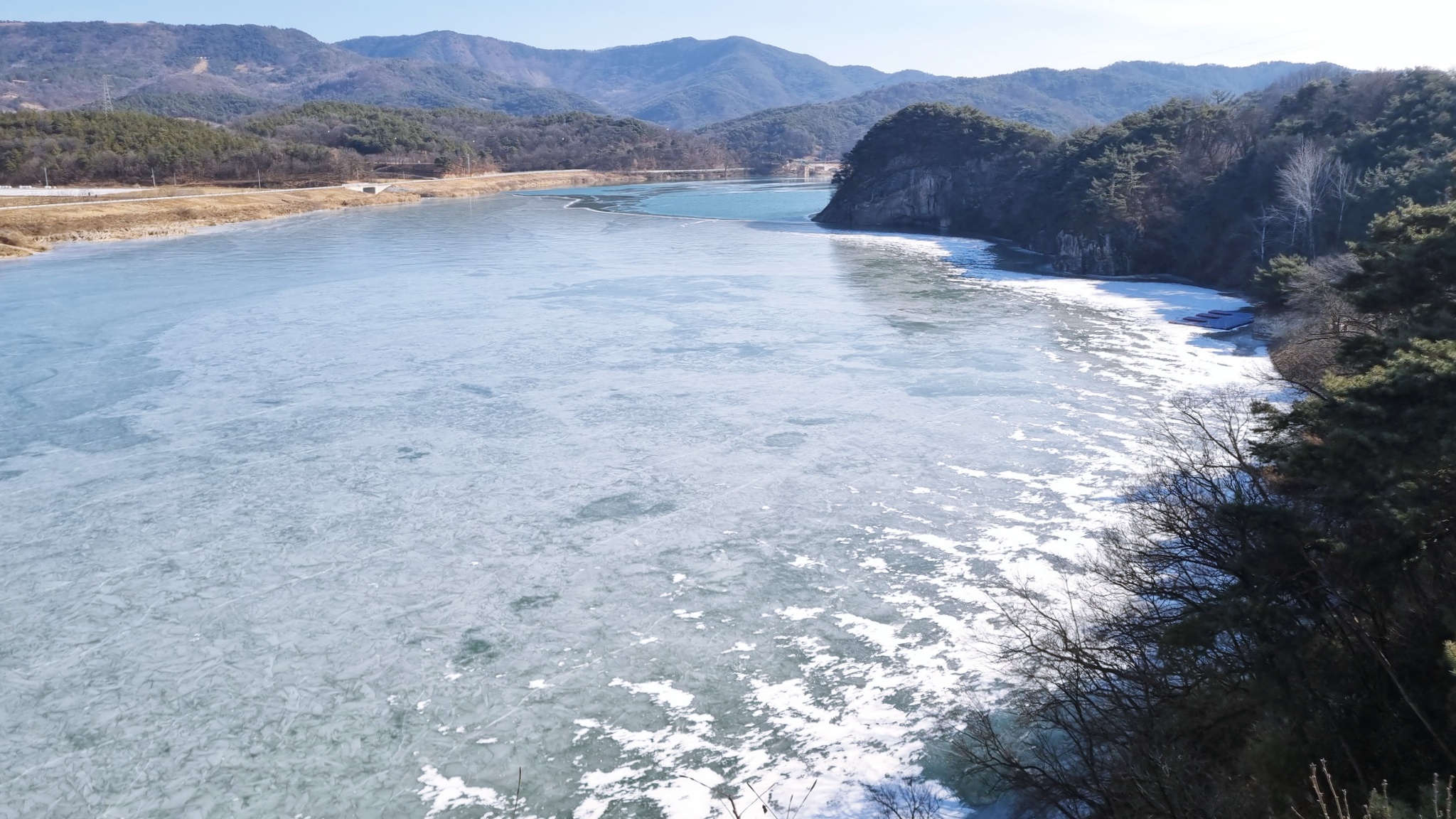 경천대에서 본 강물은 건너편 회상리의 농지를 부드럽게 휘돌아 나간다. 억겁의 세월 동안 물길이 다듬어 놓은 그 유려한 곡선을 보며 서두르지 않고 순리대로 살아온 우리들 삶의 궤적에 비유하고 싶어진다. 색채를 덜어낸 갈색의 대지와 시리도록 푸른 얼음판, 그리고 그 위를 덮은 하얀 서리의 변주. 풍경은 화려하지 않아 더 깊은 아련함을 전달한다.